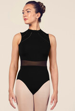 Features a breathable yet flattering sheer mesh panel centrally across the bodice, paired with luxe ladder trim for added elegance. The high neckline fastens easily with a subtle clip clasp, while the back of the leotard exposes an open V back.